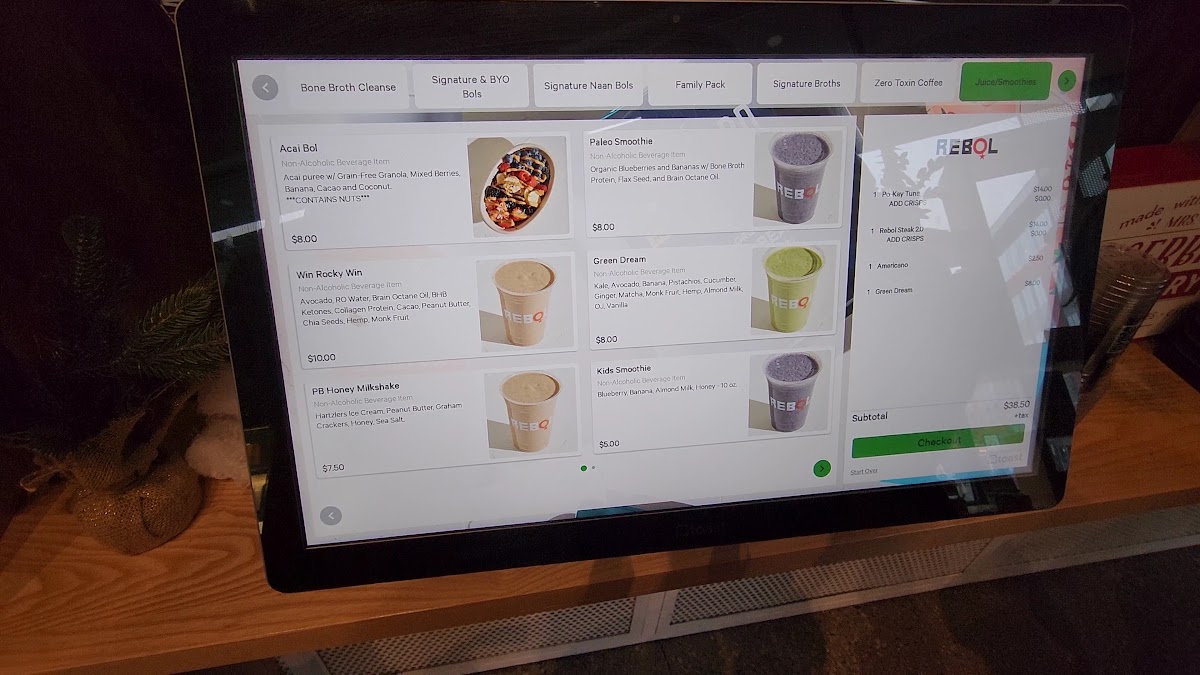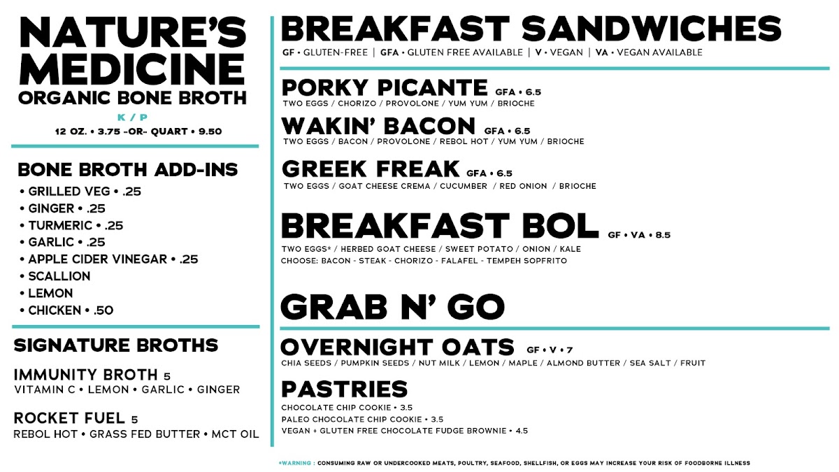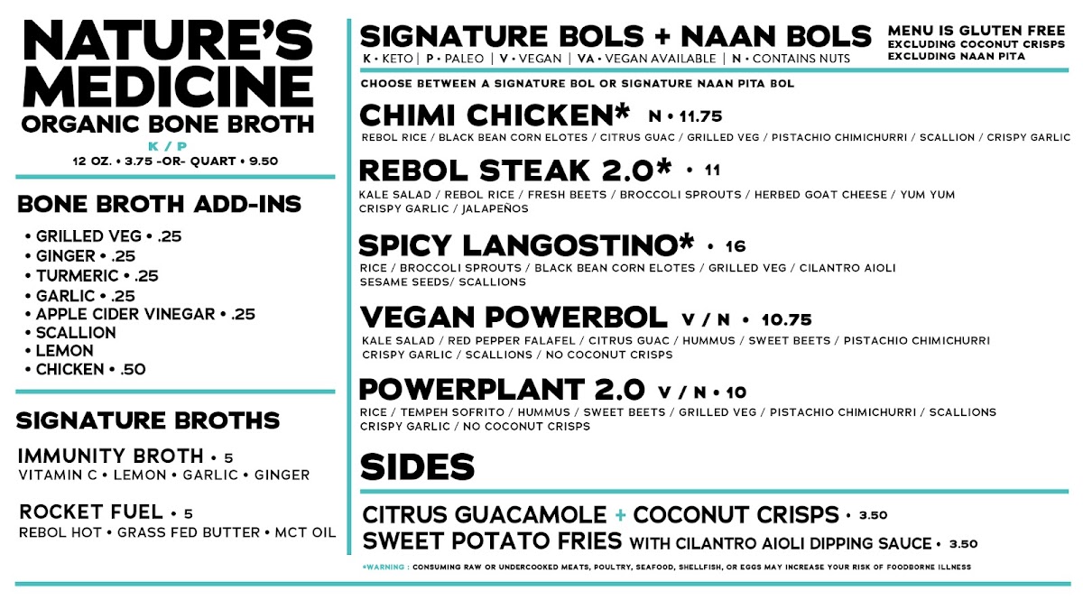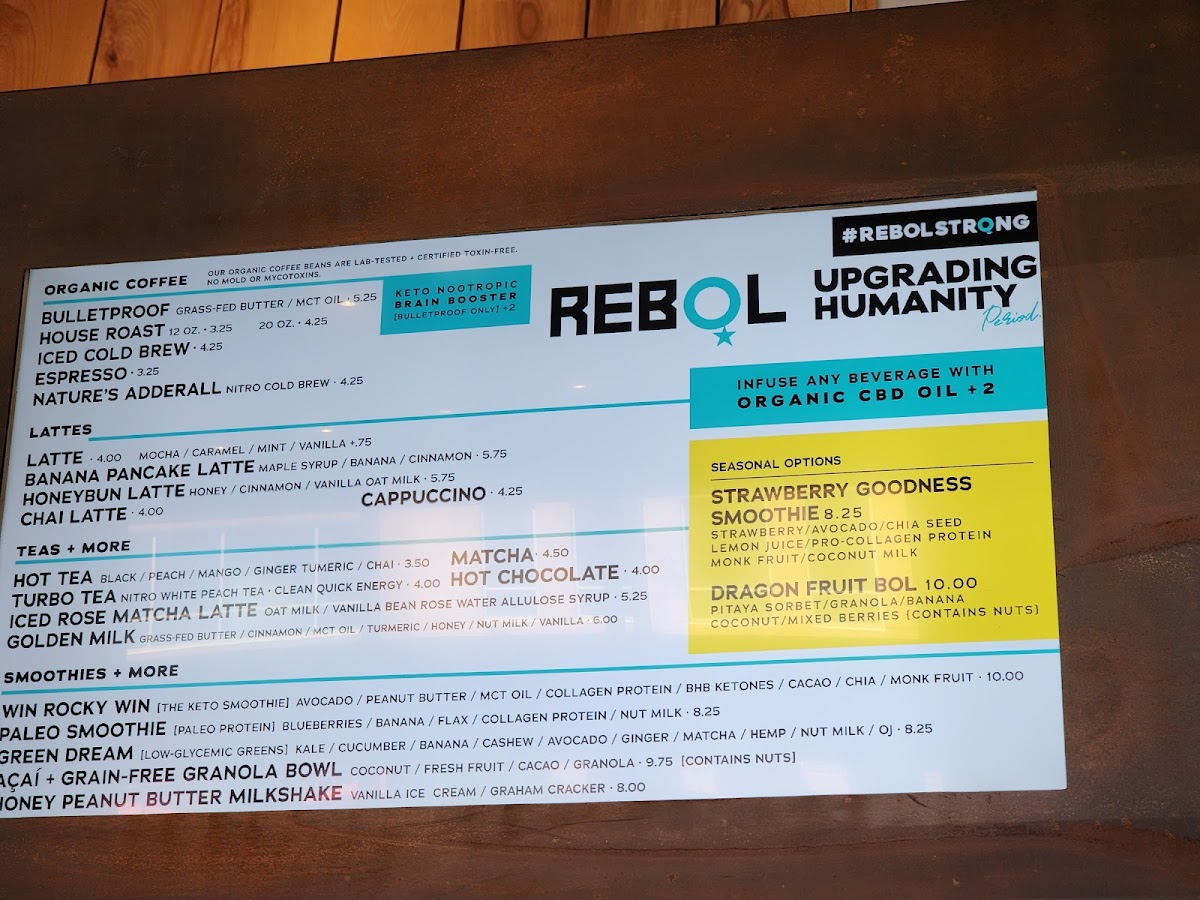 Smoothies and Bowls: The menu offers nutrient-focused smoothies including keto and paleo options with ingredients like avocado, peanut butter, collagen protein, blueberries, kale, and matcha. There is also an Acai bowl with grain-free granola and fresh fruit, catering to customers seeking grain-free and nutrient-dense choices.