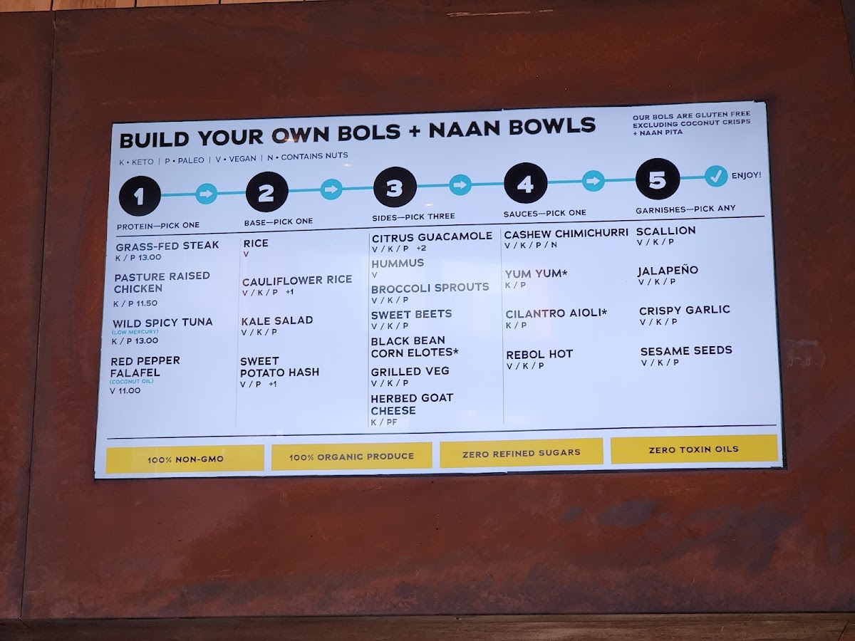 Food Selections: The food menu highlights include customizable bowls such as the “Build Your Own Bowl” with vegetarian options, precreated bowls featuring ingredients like brisket and grilled chicken with vegetables, and various light bites such as guacamole with tallow-cooked chips. Other selections include sandwiches and grain bowls that combine protein, vegetables, and flavorful sauces.